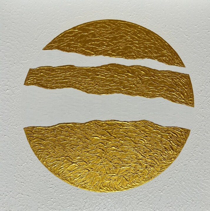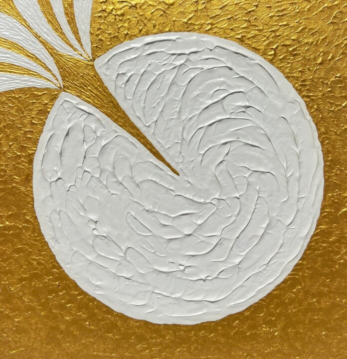 "Un instant figé, une éternité à contempler" "Sur la toile, les nuances blanches, dorées et argentées se mêlent en une danse subtile, comme un souffle lumineux qui traverse l’espace.Les reflets accrochent la lumière et la transforment au fil de la journée, C’est une invitation à ralentir, à contempler, à se laisser envelopper par la douceur et la force de l’instant.